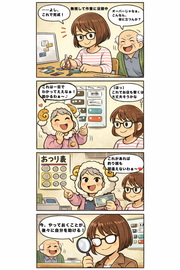 おつり早見表や商品価格表: お店を続けたい姑すそこ様のプライドを守りつつ、実務的なミスを防ぐためのサポートとしては優秀じゃないでしょうか? (`・∀・´)エッヘン!!